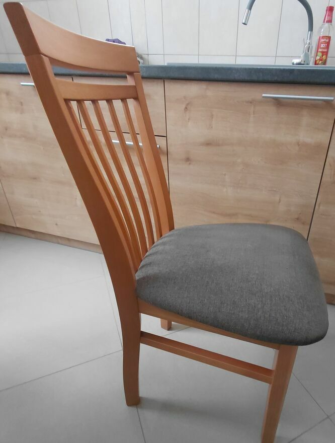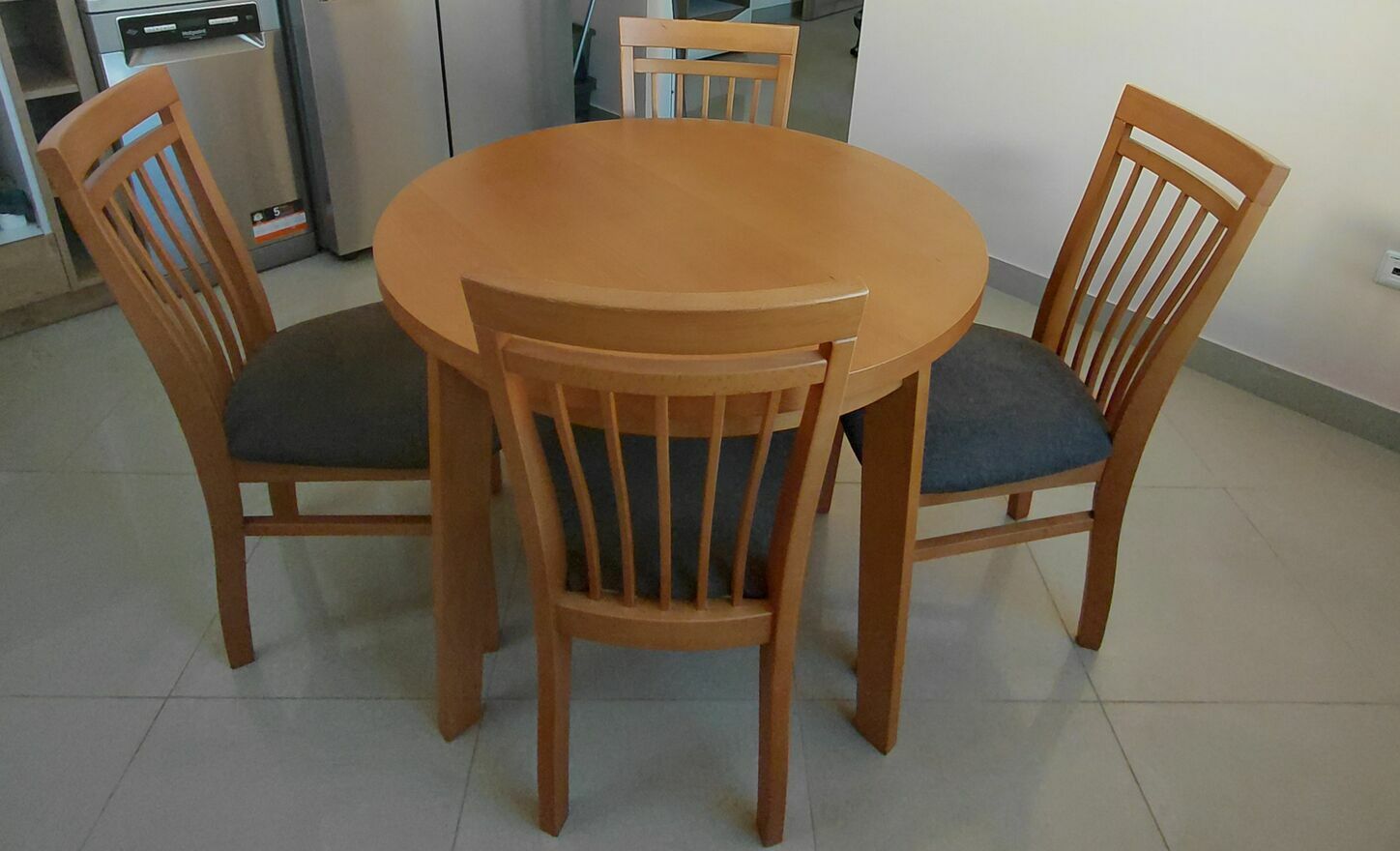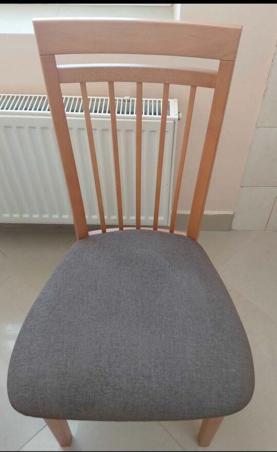 Solidny, okrągły stół z drewna bukowego z czterema krzesłami. Komplet mebli kuchennych lub jadalnianych, idealny do małego mieszkania lub domu. Stół i krzesła wykonane z wysokiej jakości materiałów, zapewniających trwałość i elegancki wygląd.Stół: